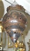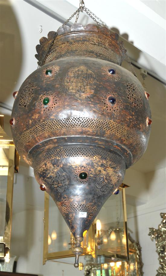 A MOROCCAN PIERCED AND JEWELLED METAL LIGHT SHADE pierced lobed body beneath a flared rim, 90cm high.