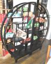 With a circular two section body and an arrangement of multiple shelves, raised on a plinth base, 174 x 172.5 x 31cm.