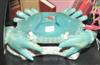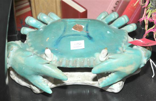 TWO GLAZED EARTHENWARE CRABS Each with a turquoise green glaze, the largest 29cm wide.