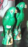 A PAIR OF VIRIDIAN GREEN GLAZED EARTHENWARE PARROT FIGURES Each raised on a pierced pedestal base, 22cm high.