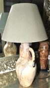 AN ARCHAIC STYLE EARTHENWARE VASE CONVERTED TO A LAMP The tapering ovoid body with two handles, painted with naive decoration beneath a cloth shade, the lamp base 54cm high.