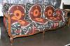 With a shaped back above scroll arms and fitted cushions, upholstered in suzani in colours of orange, black, bordeaux, raised on short cabriole legs, 206 cm length of back.