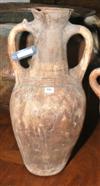 A ARCHAIC STYLE EARTHEN WARE VASE The tapering ovoid body with two handles, painted with naive decoration, the lamp base 54.5cm high.