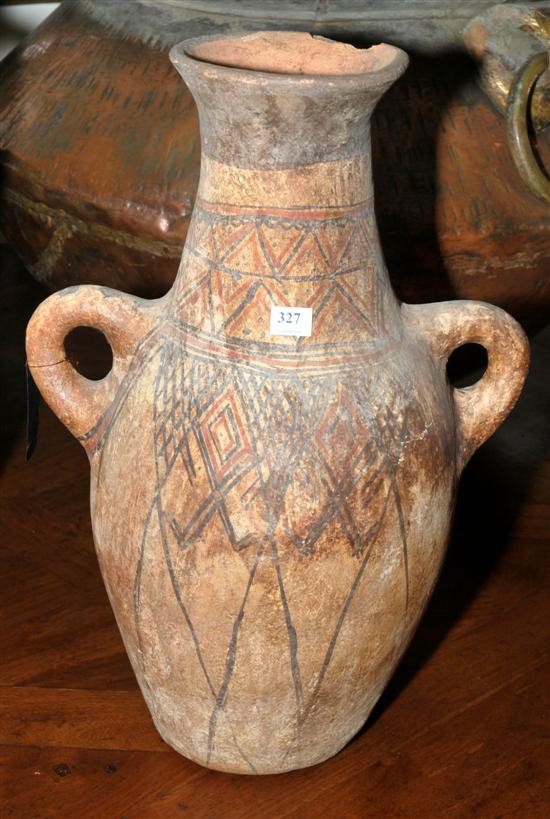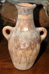 AN ARCHAIC STYLE EARTHENWARE VASE The tapering ovoid body with two handles, painted with naive decoration, the lamp base 48.5cm high.