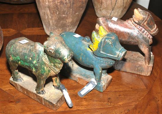 A GROUP OF THREE NAIVE PAINTED WOODEN ANIMAL FIGURES