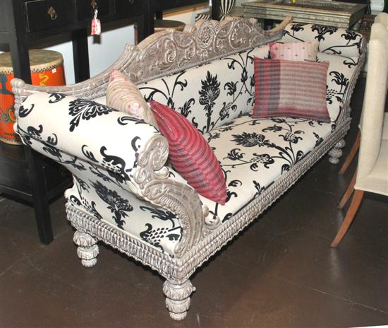 With a carved crest rail and scroll arms, upholstered in black flocked botanical print, raised on turned supports, 228cm length of back