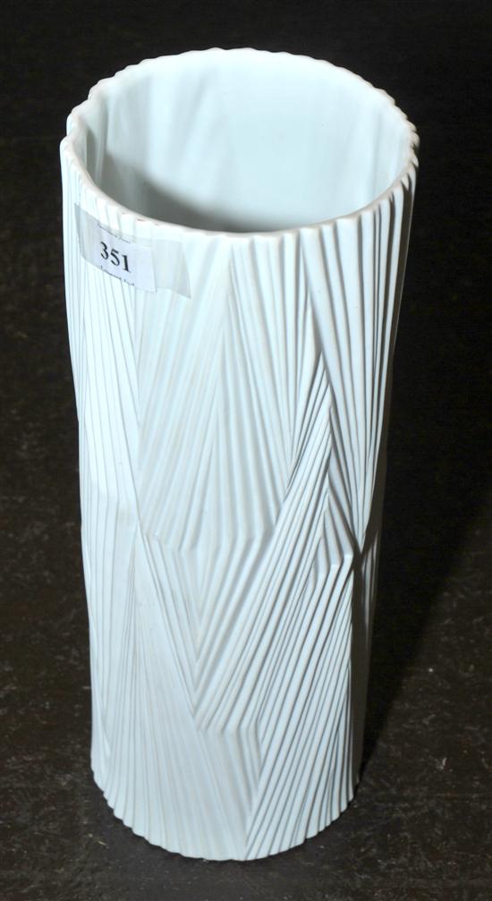 A ROSENTHAL PORCELAIN VASE Tubular with a raised texture of interlocking lozenges, 30cm high.