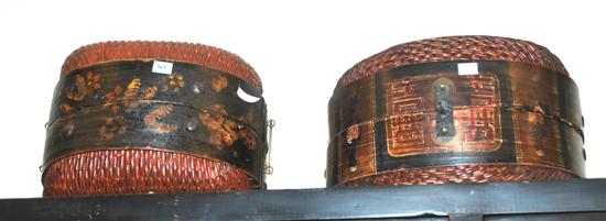 A PAIR OF CHINESE PAINTED AND LACQUERED WOVEN CANE FOOD CONTAINERS