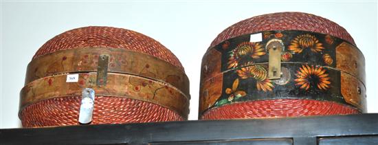 A PAIR OF CHINESE PAINTED AND LACQUERED WOVEN CANE FOOD CONTAINERS