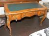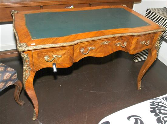 A LOUIS XV STYLE KINGWOOD AND AMBOYNA GILT METAL MOUNTED BUREAU PLAT The shaped top with a leather inset writing plane above central frieze drawers with two side drawers, raised on cabriole legs, the whole with gilt metal mounts, 130 x 79 x 72.5cm.