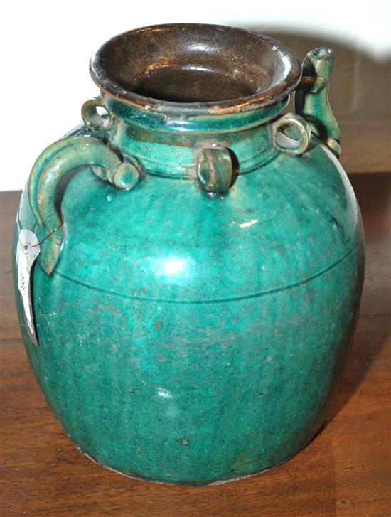 A GROUP OF THREE GREEN GLAZED WATER CONTAINERS