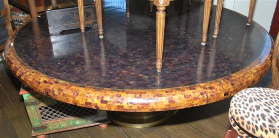 The circular top inlayed with a repeating pattern of faux tortoiseshell within a brass border, raised on a cylindrical brass base, 198cm diameter x 77cm high.