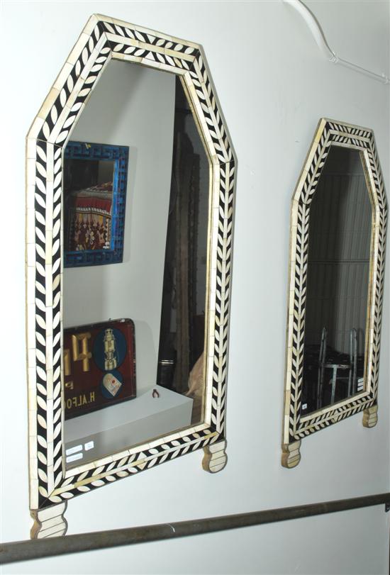 Each canted rectangular mirror plate within a surround inlaid with a repeating leaf pattern, 130 x 71cm.Note: for buyers intending to export this lot outside of Australia, CITES regulations apply. Contact department for details.