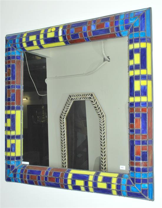 A RECTANGULAR LEADLIGHT FRAMED WALL MIRROR Elongated form with a multi coloured glass surround, 87x 88cm.