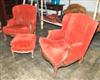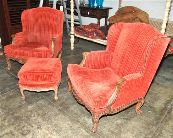 Each chair with a semi-wing back above upholstered arms and fitted seat cushions, raised on foliate and carved shell cabriole legs together with an ottoman of conforming decoration.