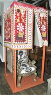 AN INDIAN QUILTED CANOPY ON FRAME AND A SILVER OVERLAID ARMCHAIR The four sided reverse appliquéd cloth depicting floral and faunal motifs suspended above a carved armchair with lion armrests and clawed feet upholstered in black flocked cloth, the frame 103 x 260 x 110cm