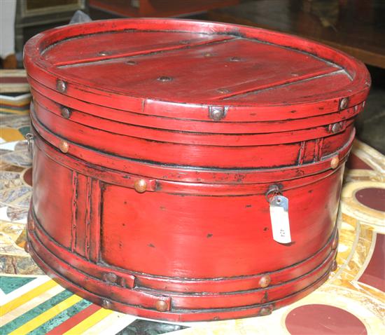 Circular, with a fitted lid, the exterior supported by studded and strapped decoration, 53cm diameter.
