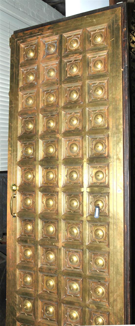 AN IMPRESSIVE PAIR OF INDIAN TEAK IRON AND BRASS DOORSEach door with a central arched panel applied with brass and iron strap work ...