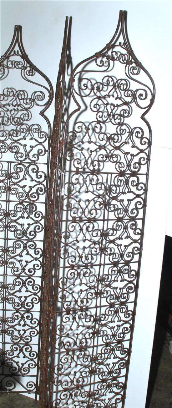 A MOROCCAN THREE PANELED WROUGHT IRON SCREEN Each pointilated panel of shaped rectangular outline, with repeating pierced foliate patterns, 206 x 126cm.