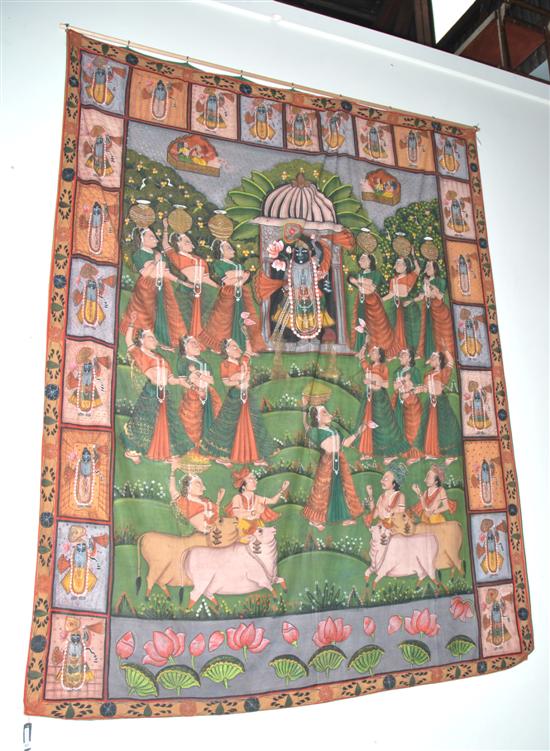 A LARGE INDIAN HAND PAINTED COTTON WALL HANGING
