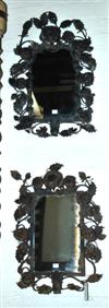 A PAIR OF WROUGHT IRON FRAMED WALL MIRRORS Each rectangular plate within a foliate surround, 66 x 39cm