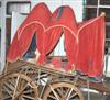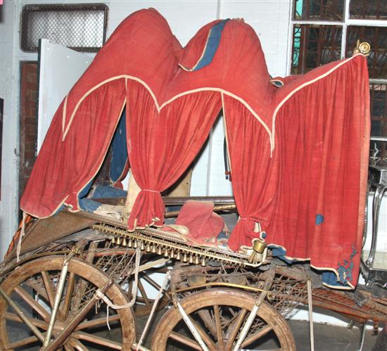 The body with domed canopy in red cotton, raised on wooden spoke wheels with a central shaft, together with assorted loose fabric and costume, 230 x 177 x 400cm