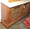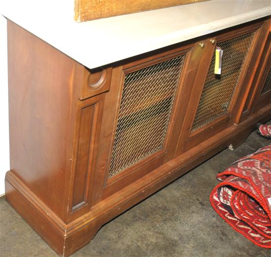 The rectangular travertine top above six doors inset with grills, raised on plinth base, 322 x 77 x 38.5cm.