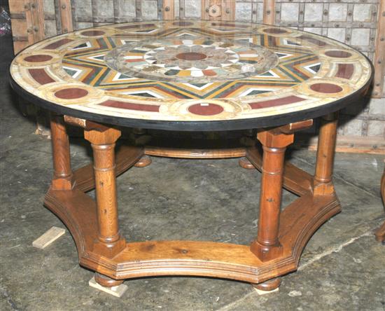 AN OAK BASED MARBLE SPECIMEN TABLE The circular top finely inlaid with contrasting geometric borders, raised on turned supports united by stretchers, 149cm diameter x 74cm high.