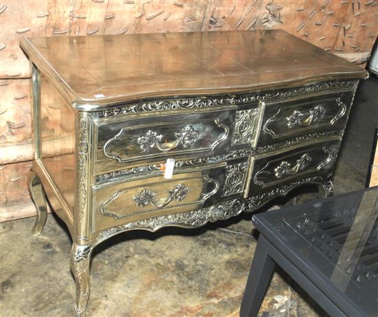 A SILVER FOIL OVERLAID LOW CHEST OF DRAWERS The serpentine rectangular top with four half width drawers, within a pressed, patterned reserve, raised on short cabriole legs, 120 x 85 x 58cm.