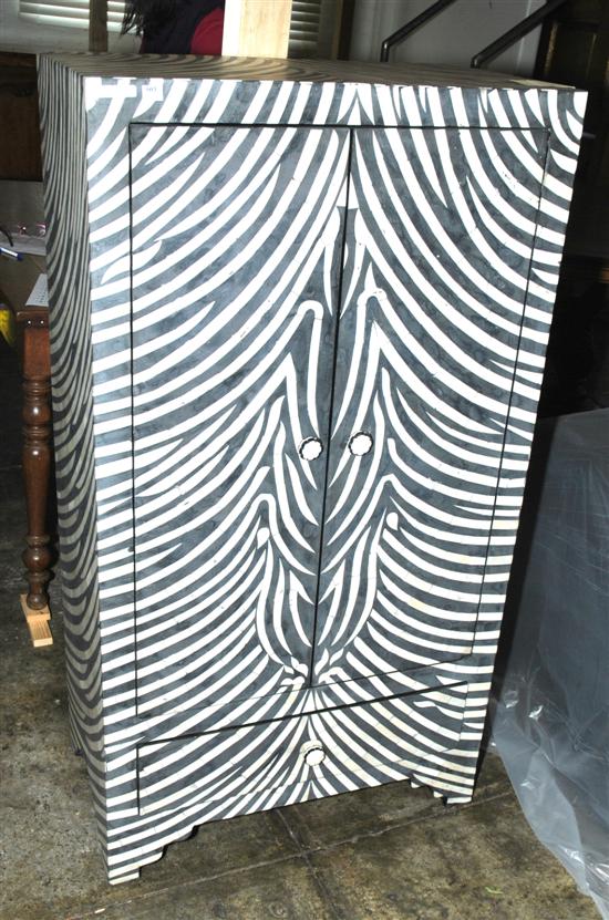 A FAUX ZEBRA STRIPE SIDE CABINET* Rectangular, with two full width doors above a single frieze drawer, 70 x 131 x 40cm.Note: for buyers intending to export this lot outside of Australia, CITES regulations apply. Contact department for details.