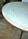 A MOROCCAN TILE INSET TABLE WITH A WROUGHT IRON BASE