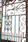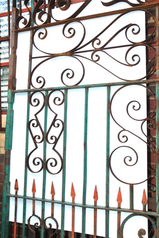 A PAIR OF PAINTED WROUGHT IRON GATES Each painted green with scroll and linear panels, 313 x 196cm.