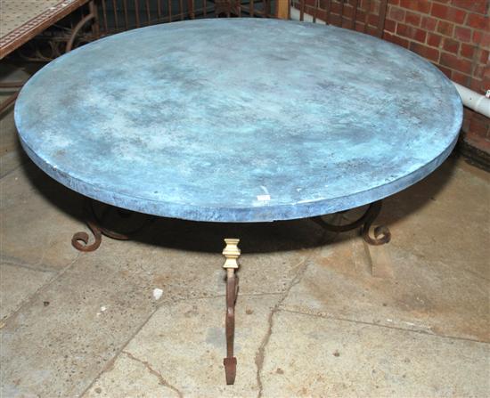 A WROUGHT IRON AND COMPOSITE OUTDOOR TABLE