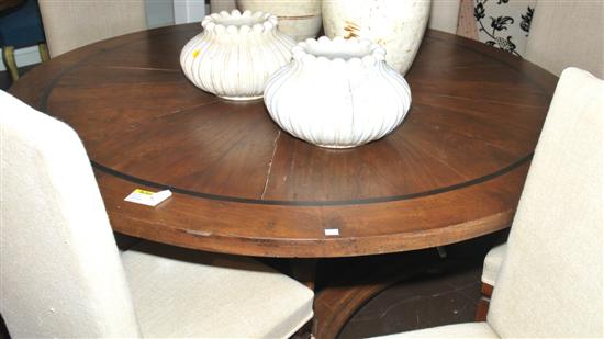The top inlaid with an ebonised border, above an open base and bun feet united by concave stretchers, 183.5cm diameter x 76cm high.