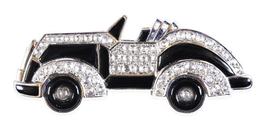 Styled as a vintage automobile, set with rose cut diamonds and onyx highlights, in 18ct white gold.