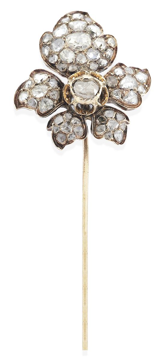 Styled as a flower encrusted with rose cut diamonds, in 15ct gold and silver.