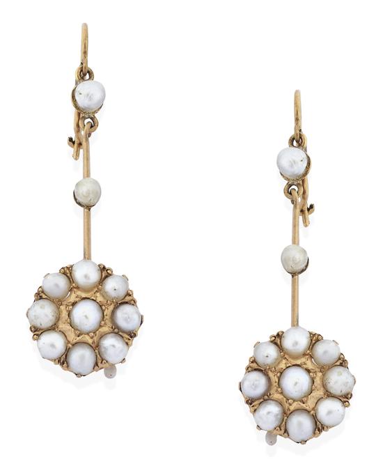 Each earring comprising a floral cluster of seed pearls suspended on a knife edge bar with further pearl detail, to hook fittings in 9ct gold.