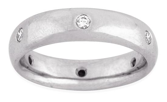 The half round band hammer set with six round brilliant cut diamonds totalling 0.30cts, in platinum, ring size S-T.