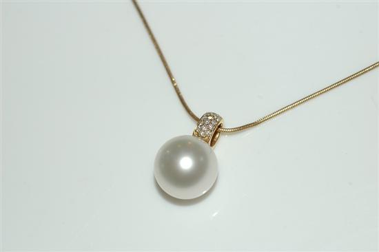 The round pearl of silver white hues measuring 12.6mm, to a pave diamond set bale, suspended on a fine snake chain, in 18ct gold, boxed, independent valuation available.