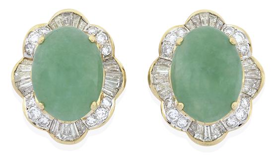 Each earring centrally set with an oval jade cut en cabochon, surrounded by round brilliant and tapered baguette cut diamonds totalling 3.04cts, in a scalloped setting to post and clip fittings in 18ct gold, independent valuation available.