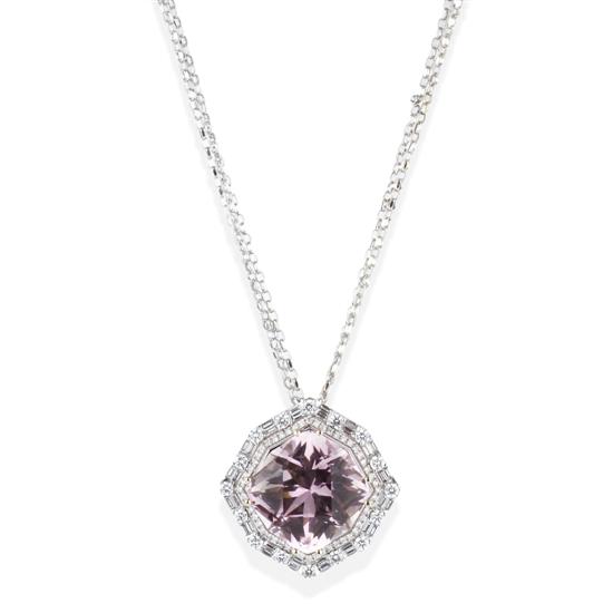 Centrally set with a mixed cut kunzite weighing 57.33cts, surrounded by baguette and round brilliant cut diamonds totalling 3.85cts, to a triple strand belcher link chain, in 18ct white gold, independent valuation available.