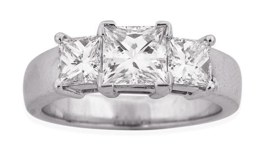 Centrally set with a princess cut diamond weighing 1.11cts, flanked by a princess cut diamond to each side, together totalling 1.04cts, in 18ct white gold, independent valuation available, ring size M-N.