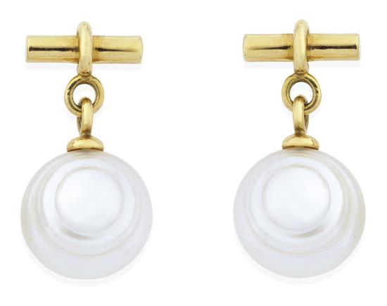 Each earring comprising a button shaped pearl of silver white hues, measuring 12.7mm suspended below a t-bar, to post and butterfly fittings in 18ct gold, with box and papers.