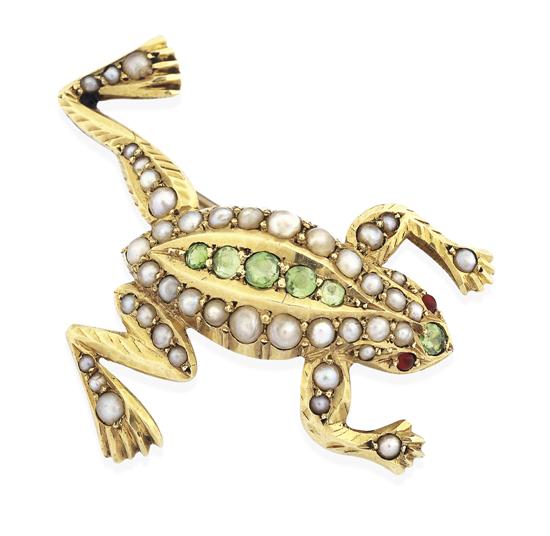 The finely detailed frog, set with garnet and seed pearl, in 15ct gold, by Duggin Shappere & Co.