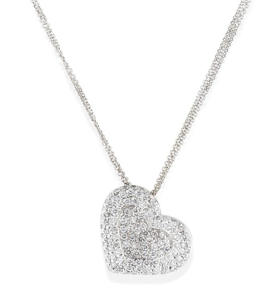 The concave heart pave set with round brilliant cut diamonds totalling 2.0cts, suspended on a triple strand trace link chain, in 14ct white gold.