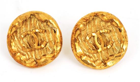 The circular textured earrings with applied monogram design, styled in gilt metal, to clip fittings.
