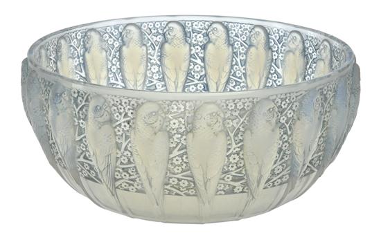 A RENE LALIQUE PERRUCHES PATTERN OPALESCENT GLASS BOWL