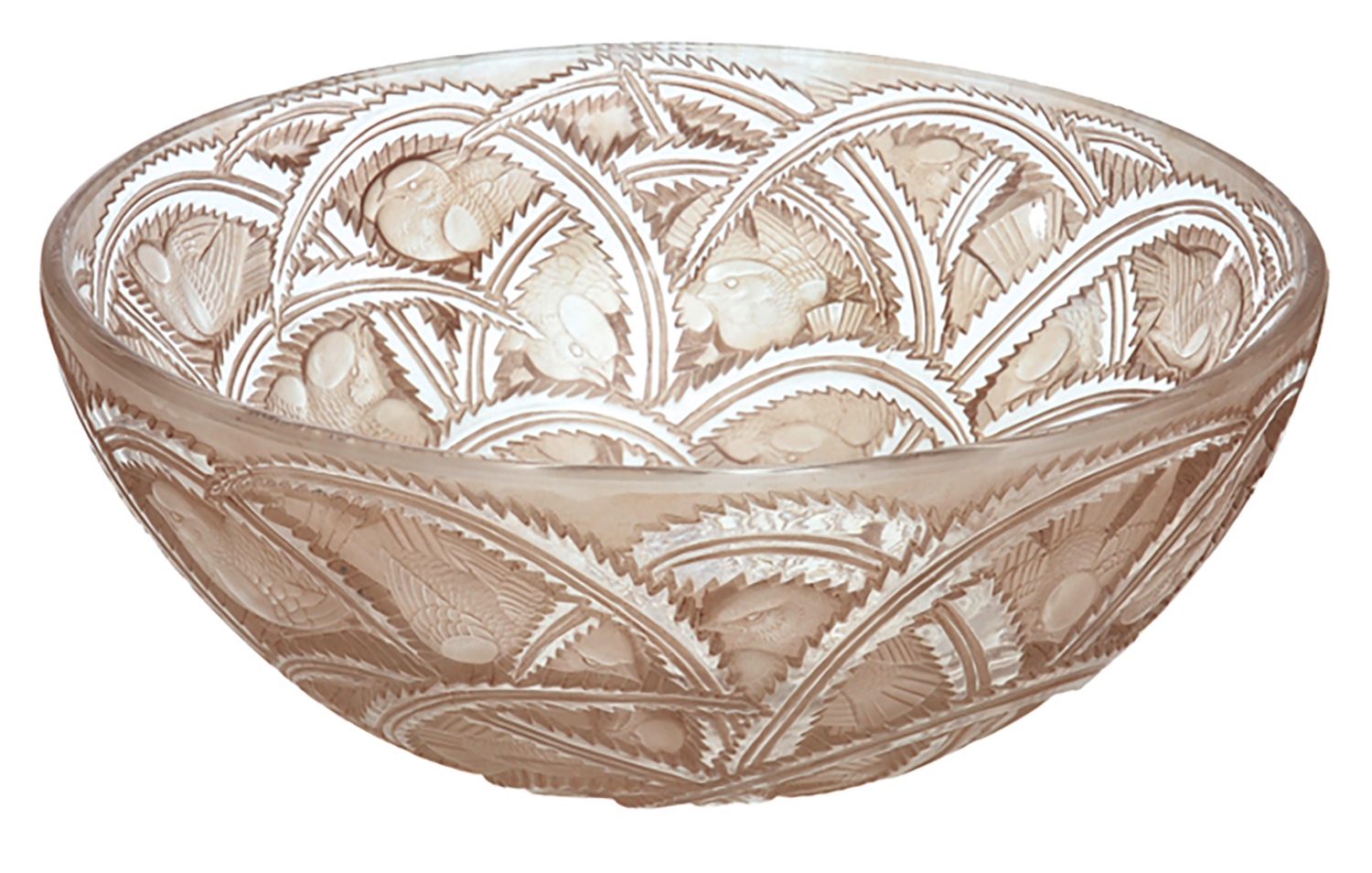 A RENE LALIQUE PERRUCHES PATTERN OPALESCENT GLASS BOWLMODEL INTRODUCED 1931