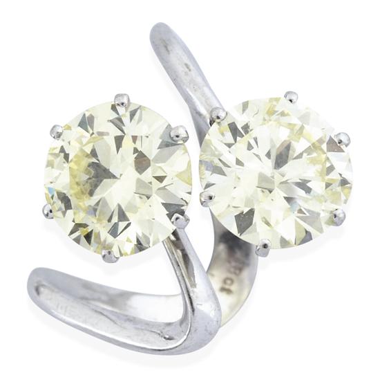 Of crossover design, set with two round brilliant cut diamonds weighing 4.29cts and 4.37cts respectively, in 18ct white gold, independent valuation available, ring size O-P.
