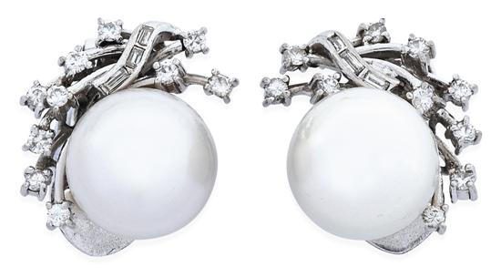 Each earring set with a near round pearl of silver white hues, measuring 12.1mm within a spray of round brilliant and baguette cut diamonds, to clip fittings, in 9ct white gold.